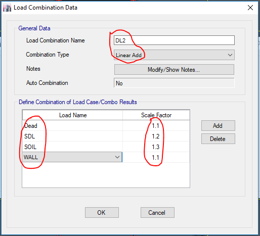 DL2 = 1.1*Dead + 1.2*SDL + 1.3*SOIL + 1.1*WALL